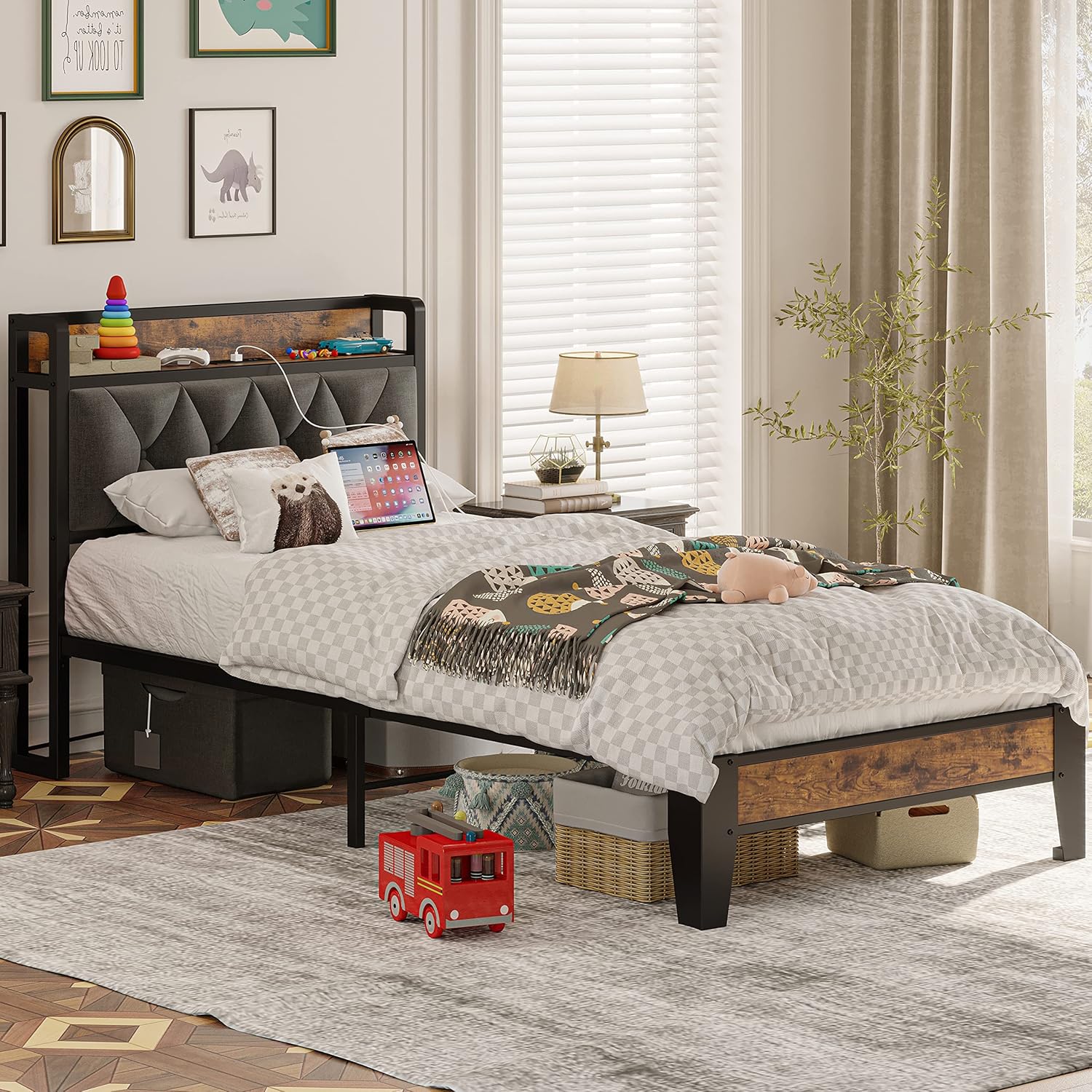 ANCTOR Twin Bed Frames, Storage Headboard with Outlets, Easy to Install, Sturdy and Stable, No Noise, No Box Springs Needed - Perfect for a Good Night's Sleep