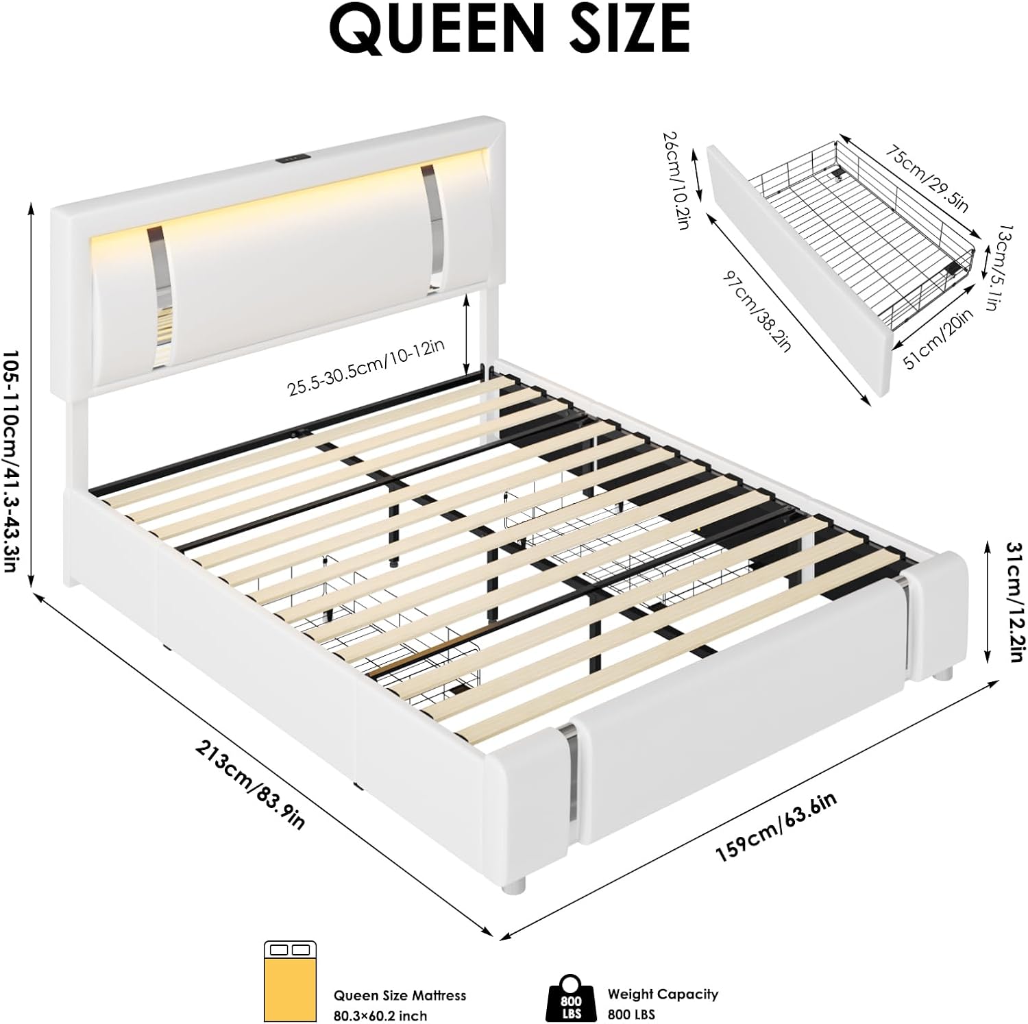Keyluv Queen Bed Frame with RGB LED Lights Headboard & 2 Storage Drawers, Modern Upholstered Faux Leather Smart Platform Iron Metal Decor, USB USB-C Charging Ports, No Box Spring Needed, White