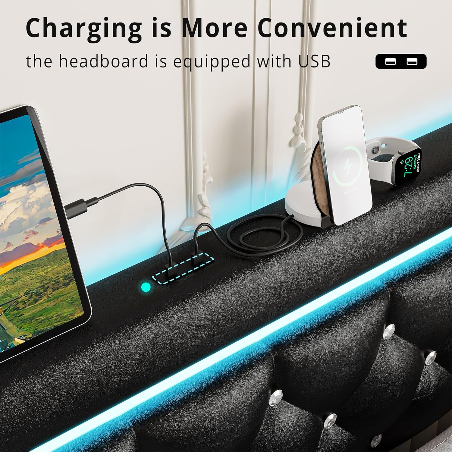 LIKIMIO Full Size Bed Frame with LED Light, PU Leather Platform Bed Frame with 4 Drawers, Adjustable Crystal Button Tufted Headboard, No Box Spring Needed, Black