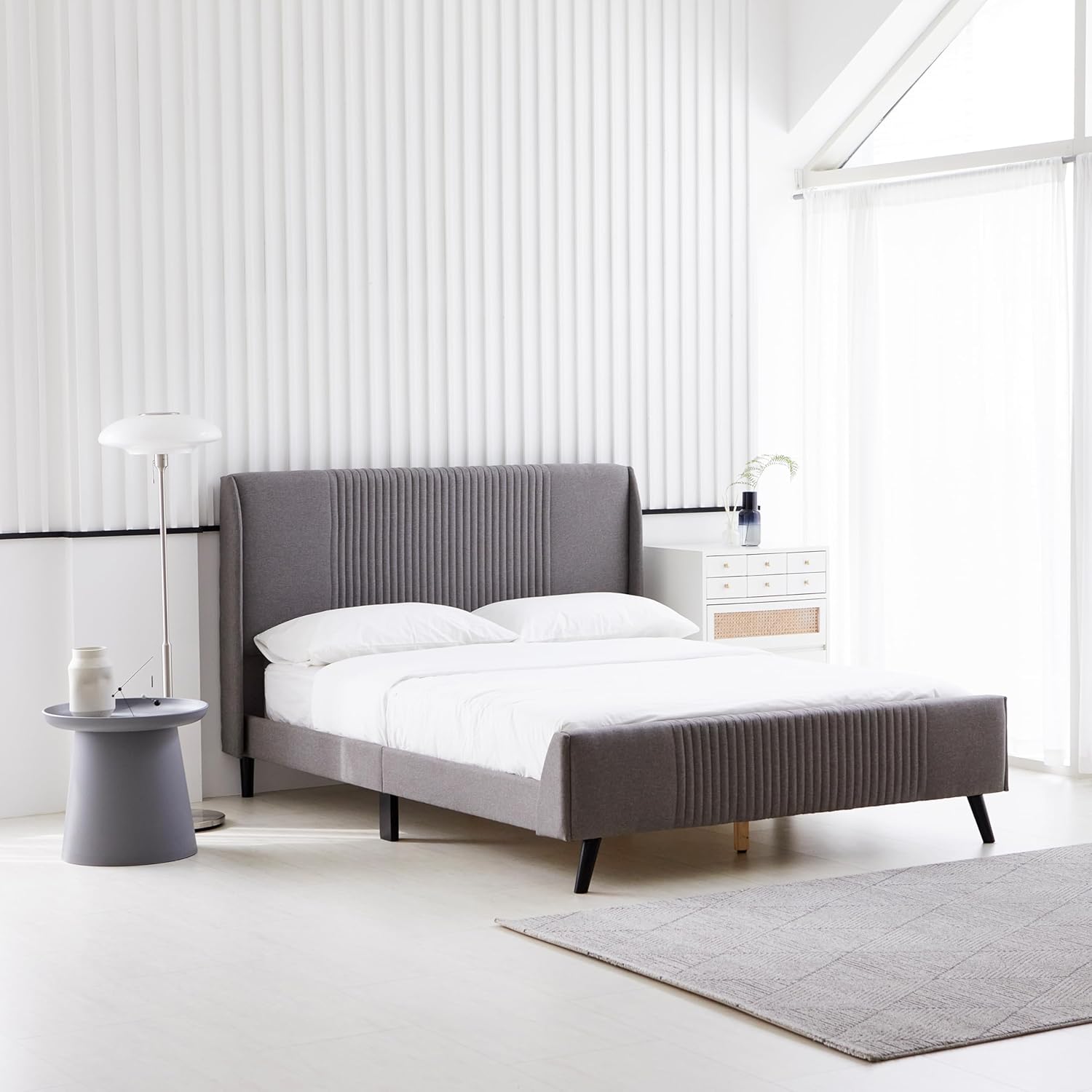 Livinia Sunset King Size Wingback Platform Bed, Fabric Upholstered King Bed Frame with Vertical Channel Tufted Headboard Footboard, Strong Wood Slats, No Box Spring Needed, Gray