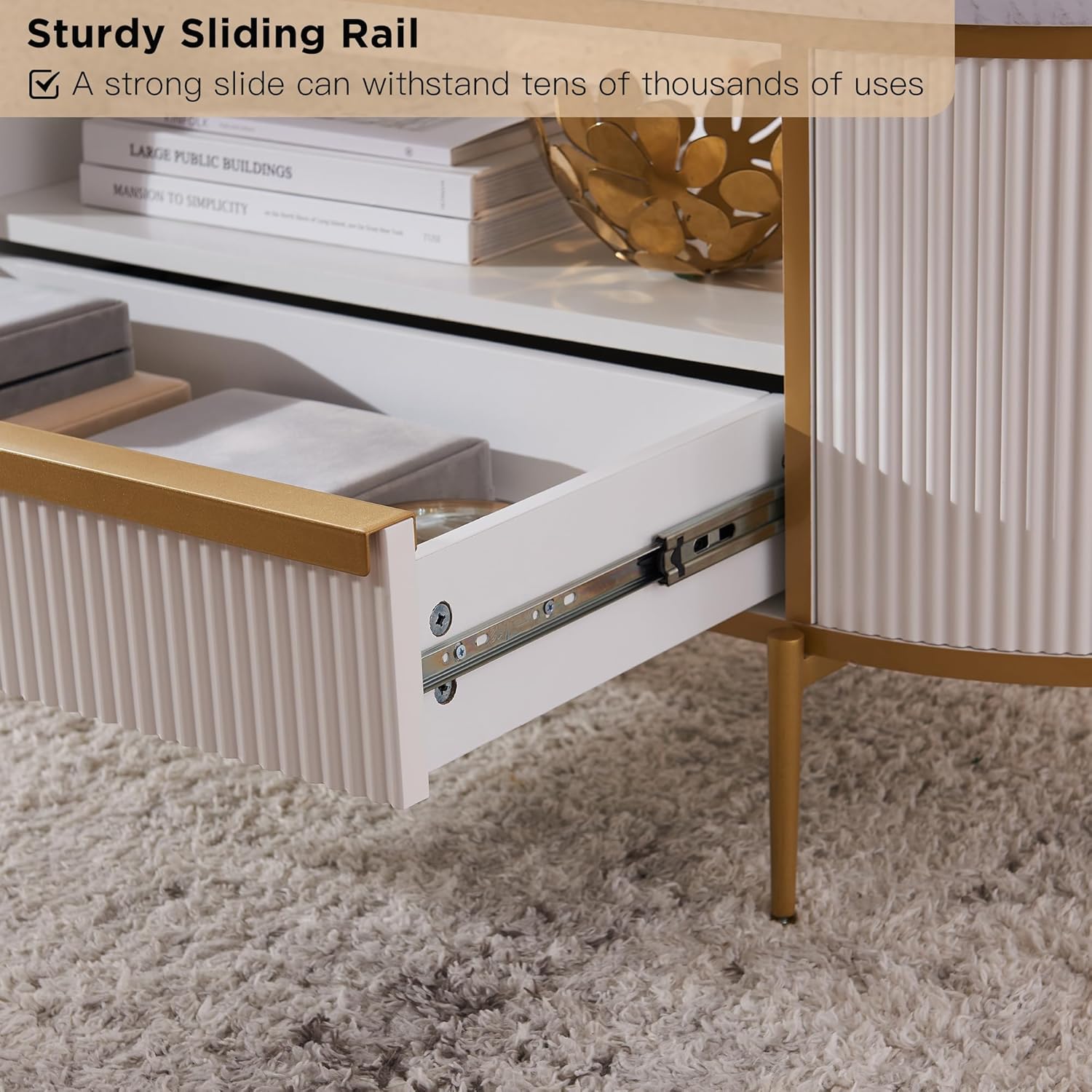 OKD Modern Luxury Fluted Coffee Table, 48" Oval Coffee Table with Drawer, Faux Marble Top, Curved Profile Design, Gold Metal Decor, Center Table for Living Room, Off White