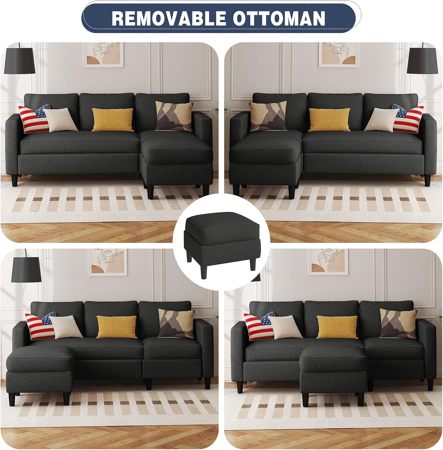 Shintenchi Small Sectional Couch Sofas, 3 Seat L Shape Sofa with Ottoman, Fabric Upholstered Convertible Sofa Couches, Small Couch for Apartments, Living Room and Office (Black)